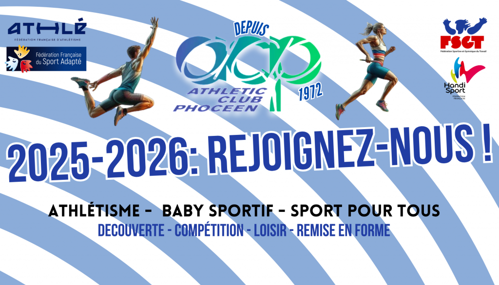 L’Athletic Club Phocéen situé à Marseille dans le département des Bouches-du-Rhône (13) est affilié à la FFA et à la FSGT. Nous mettons notre savoir-faire à votre disposition pour vous former à l’athlétisme aussi bien en loisir qu’en compétition (saut, lancer, course et marche). Nous disposons d’une équipe de dirigeants diplômés bénévoles et vous serez encadrés par des entraîneurs diplômés FFA.